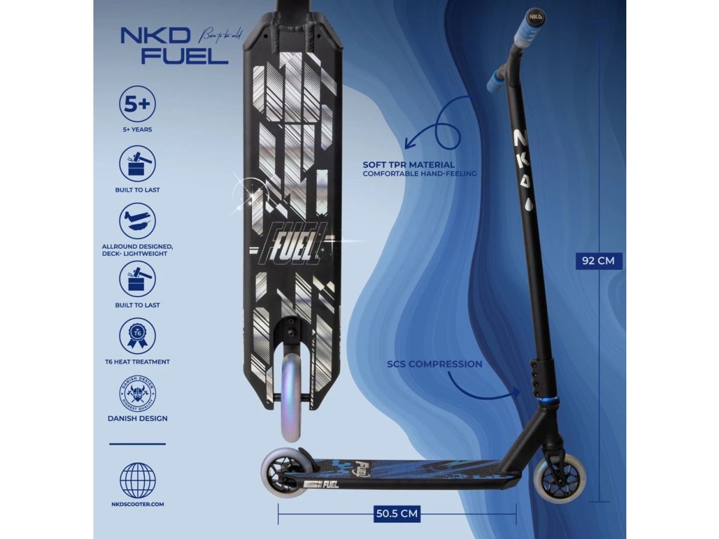 Freestyle koloběžka NKD FUEL je mistrovským dílem moderního designu. Vhodná je pro jízdu v parku i na ulici.