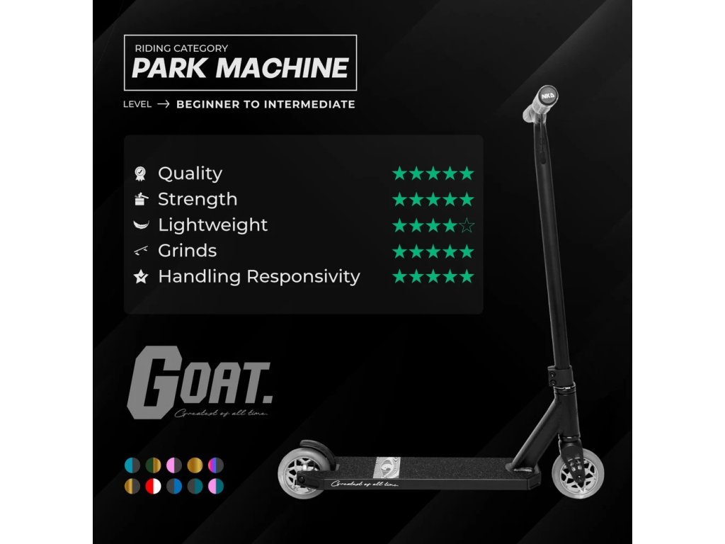 Freestyle koloběžka NKD GOAT je vhodná pro začátečníky i pokročilé jezdce od 5 let. Ať už míříte do skateparku nebo